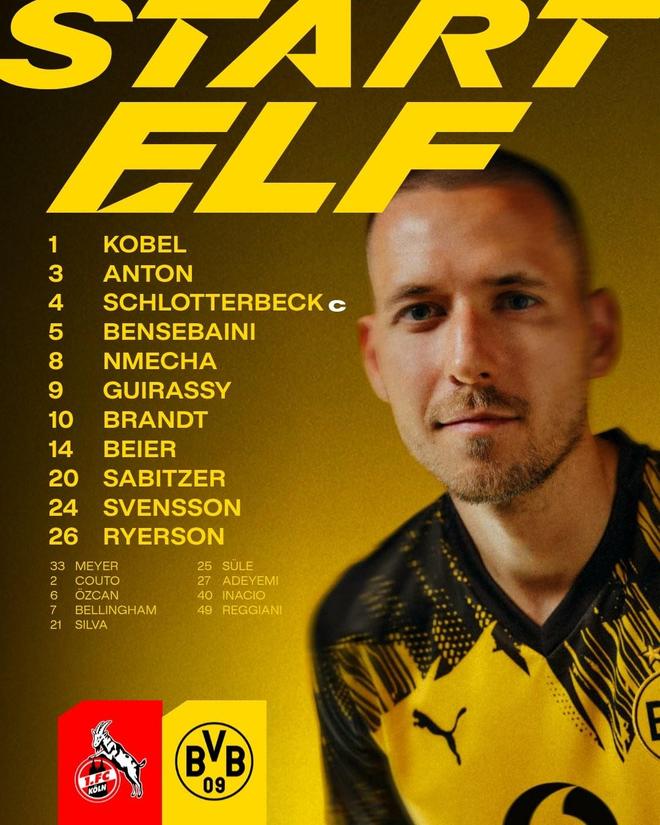 多特首發:1-科貝爾、4-施洛特貝克、5-本塞拜尼、3-安東、24-丹尼爾-斯文鬆、8-費利克斯-恩梅加、20-薩比策、26-瑞爾森、10-布蘭特、9-吉拉西、14-拜爾