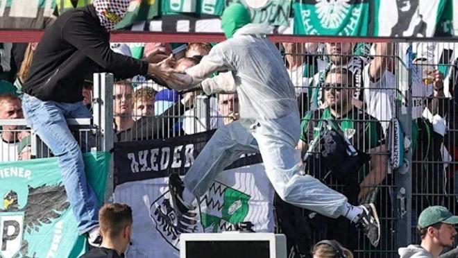 據普魯士明斯特俱樂部官網發布的信息,一名戴麵具的球迷混入體育場內部區域,故意拔掉了VAR屏幕的電源線,意圖幹擾回看過程。德國媒體還報道,與此同時,主隊球迷打出了反對VAR技術的橫幅,上麵寫著:“拔掉VAR的插頭”。