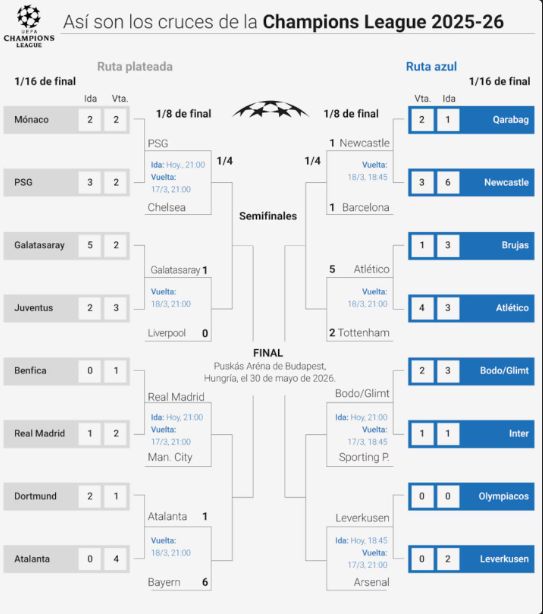 上半區:加拉塔薩雷與利物浦的勝者,將迎戰巴黎聖日耳曼和切爾西的勝者;皇家馬德裏若能淘汰曼城,將在八強遭遇拜仁與亞特蘭大的勝者。