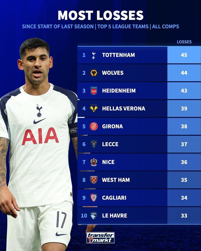 根據德轉的數據統計,熱刺上賽季以來各項賽事輸掉45場,是五大聯賽最多的球隊。